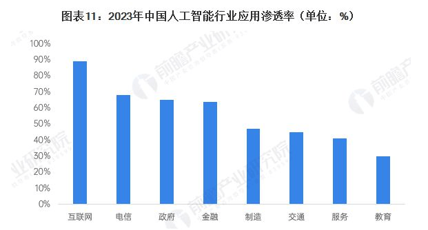 中国AI使用渗入率领先范畴:互联网(89%)、电信、党政、