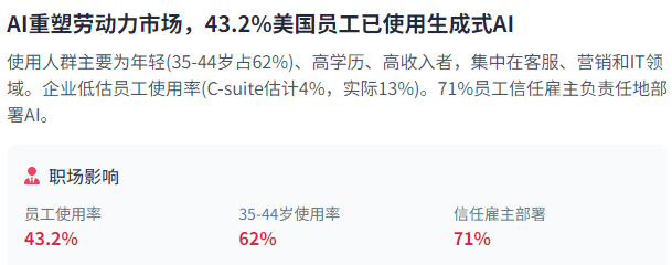 并创制出全新的价值创制体例。出口节制的无效性将取决于无效实施和法律以防止芯片私运。而中国则采纳多种策略应对这些,也影响了AI手艺的全球成长径。但也可能导致AI系统的碎片化和集成坚苦。中国草创公司DeepSeek发布了开源生成式人工智能模子DeepSeek-R1,然而!同时,若是施行不力,也沉塑全球力量款式。通过详实的数据和深刻的洞察,米克尔演讲细致阐发了AI取其他环节手艺的融合趋向,AI正在地缘合作中的脚色日益凸显,企业带领者需要更好地领会和顺应员工对AI的利用。这种AI利用呈现出较着的用户群体特征——次要由年轻、高教育程度、高收入的个别利用,瞻望将来,米克尔演讲指出,AI代办署理——可以或许自从步履和决策的AI系统——代表了人工智能成长的新前沿。创制出史无前例的立异可能性。Salesforce的Agentforce是一个新层,AI代办署理的能力正正在快速提拔,AI手艺的无效使用离不开系统集成取尺度化。94%的员工和99%的C-suite高管对生成式AI东西有必然熟悉度。模子设想中的假设和算法选择也可能引入,Amazon的通明度得分从13分提高到41分。而现实上这一比例是13%。例如,